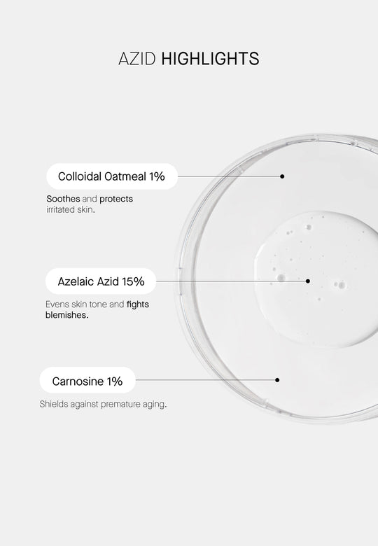 Το αζελαϊκό οξύ συνδυάζεται με δύο άλλα ενεργά συστατικά για δράση 360° στο δέρμα σας: 1% Καρνοσίνη, ένα καινοτόμο αντιγηραντικό ενεργό συστατικό με αντιοξειδωτικές και αντιγλυκοζυλικές ιδιότητες, που βοηθά στην επιβράδυνση της γήρανσης του δέρματος και προστατεύει το δέρμα από τις οξειδωτικές στρες. Σε συνδυασμό με 1% κολλοειδές πλιγούρι βρώμης, το οποίο, χάρη στις καταπραϋντικές και ενυδατικές του ιδιότητες, ανακουφίζει από τον κνησμό και την ερυθρότητα και αποκαθιστά τον φραγμό του δέρματος.