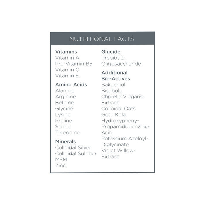 Με κολλοειδές σύμπλεγμα θείου-αργύρου-βρώμης, MSM, σαλικυλικό οξύ, ψευδάργυρο, βιταμίνη C, Gotu Kola, Bisabolol, πρεβιοτικά και Bakuchiol