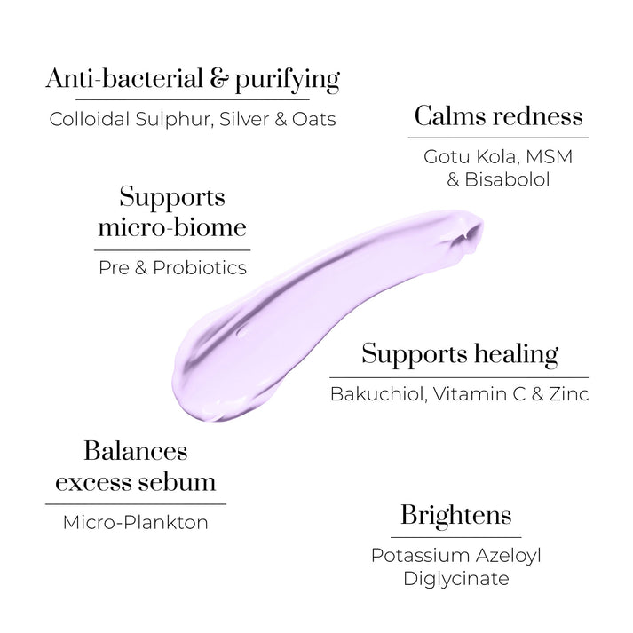Pentylene Glycol, Salix Daphnoides (Violet Willow) Bud/Leaf/Stem Extract, Leuconostoc/Radish Root Ferment Filtrate, Potassium Azeloyl Diglycinate, Caprylic/Capric Triglyceride, Citric Acid, Bakuchiol, Trehalose, 4-t-Butylcyclohexanol, Sulphur (Sulfur), Panthenol (Provitamin B5), Avena Sativa (Oat) Kernel Flour, Betaine, Allantoin, Zinc Glycinate, Colloidal Silver, Centella Asiatica (Gotu Kola) Flower/Leaf/Stem Extract, Hexylresorcinol, Inulin, Ethyl Linoleate, Bisabolol, Sodium PCA, Hydroxyphenyl Propamidobenzoic Acid, PCA, Alpha-Glucan Oligosaccharide, Opuntia Ficus-Indica Stem Extract, Chlorella Vulgaris Extract, Serine, Alanine, Glycine, Tocopheryl Acetate, Glyceryl Linoleate, Glyceryl Linolenate, Lysine HCl, Threonine, Glutamic Acid, Arginine, Retinyl (Vitamin A) Palmitate, Sodium Ascorbyl Phosphate, Proline, Ascorbyl Palmitate, Glyceryl Undecylenate, Sodium Gluconate, Butylene Glycol, Hectorite, Cocos Nucifera (Coconut) Extract, Rosa Damascena Extract, Lavandula Angustifolia (Lavender) Oil, Sodium Lactate, Glyceryl Caprylate, Hydroxyethcellulose, Propanediol, Tetrasodium Pyrophosphate, Dehydroacetic Acid, Xanthan Gum, Benzyl Alcohol, Sorbitol, Lecithin, Sodium Benzoate, Potassium Sorbate, Disodium EDTA, CI 77007 (Ultramarines), Linalool*, Citronellol*, Geraniol*, Limonene*